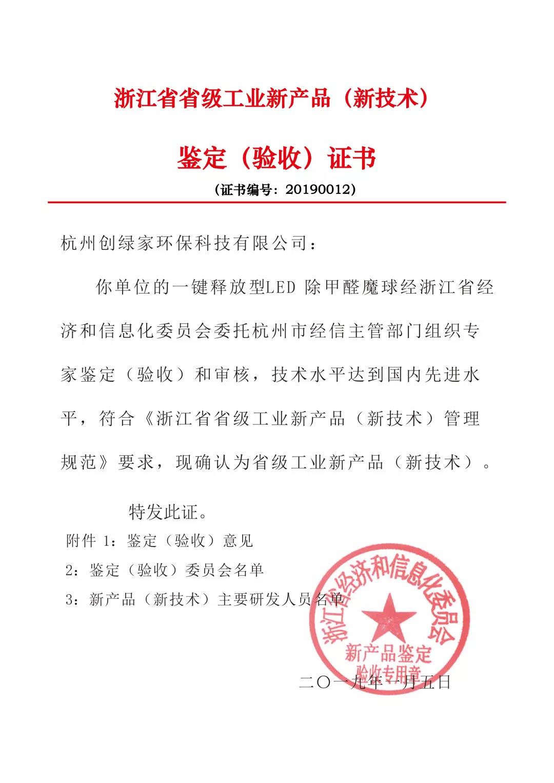 創(chuàng)綠家環(huán)保旗下明星產(chǎn)品搖一搖除甲醛魔球經(jīng)浙江省經(jīng)濟(jì)和信息化委員會(huì)委托杭州市經(jīng)信主管部門組織專家鑒定(驗(yàn)收)和審核,技術(shù)水平達(dá)到國內(nèi)先進(jìn)水平,符合《浙江省省級(jí)工業(yè)新產(chǎn)品(新技術(shù))管理規(guī)范》要求,現(xiàn)確認(rèn)為省級(jí)工業(yè)新產(chǎn)品(新技術(shù))。