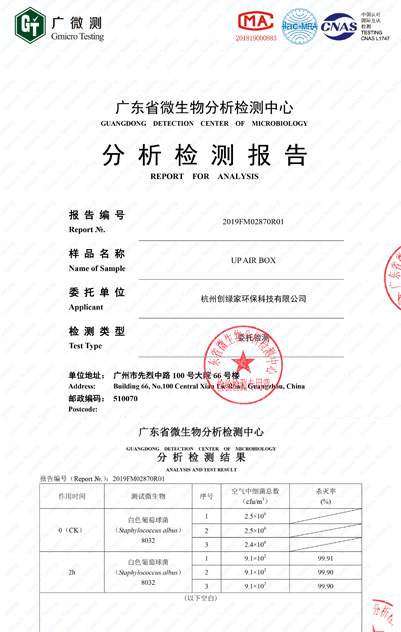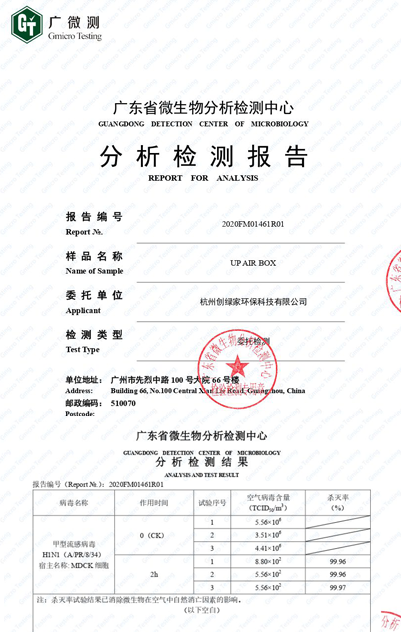 H1N1病毒殺滅率99.97%                   殺菌率99.9%