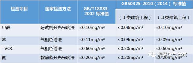 注2:相比于GB50325-2010(2014)標準,GB/T18883-2002標準對甲苯和二甲苯兩個項目也有具體要求,數(shù)據(jù)都是≤0.20mg/m3;