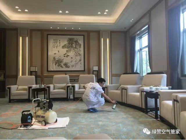 先配合高溫熏蒸機對地毯表面進行高溫熏蒸清潔,在用“GREENCOAT”織地毯除味劑、“GREENCOAT”復合光觸媒對地毯進行均勻噴涂,噴涂的流程順序、藥劑用量均需要工程師根據(jù)實際情況合理施工。